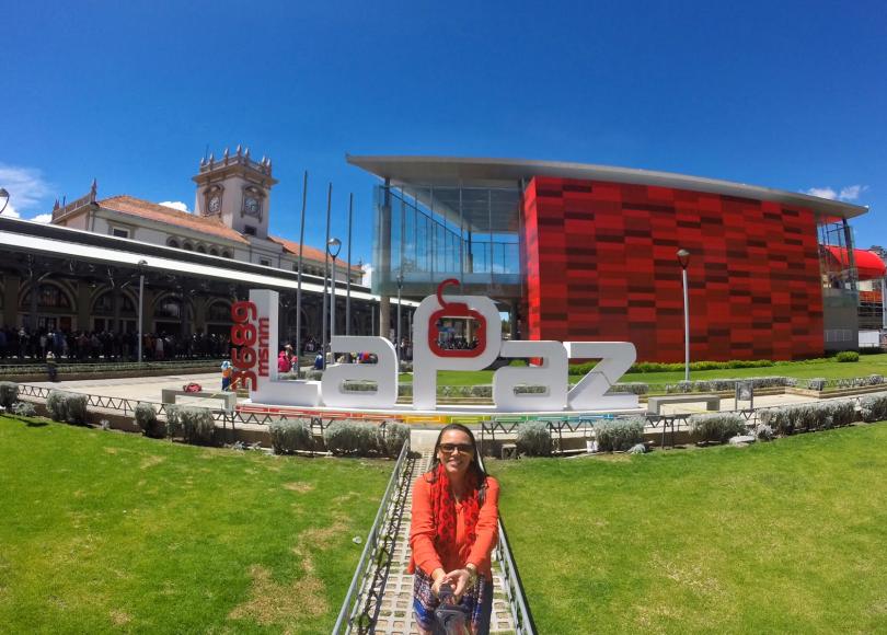 Fomos para a Estación Teleferico Central – linea roja, de onde partem os teleféricos para a cidade de El Alto. Para quem não sabe, o teleférico é o meio de transporte mais eficiente da cidade e também o mais utilizado. Tiramos muitas fotos no letreiro escrito La Paz que fica em frente à Estación Central e que marca que La Paz está a 3.689 msnm (metros acima do nível do mar).