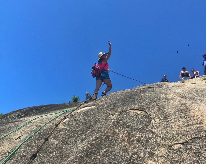 Já no topo, tinha um pessoal fazendo rapel e a descida era de R$40 por pessoa. A vista de lá é mais perfeita ainda pessoalmente. A subida total da trilha durou cerca de 45 minutos (com paradas para fotos) e valeu demais!