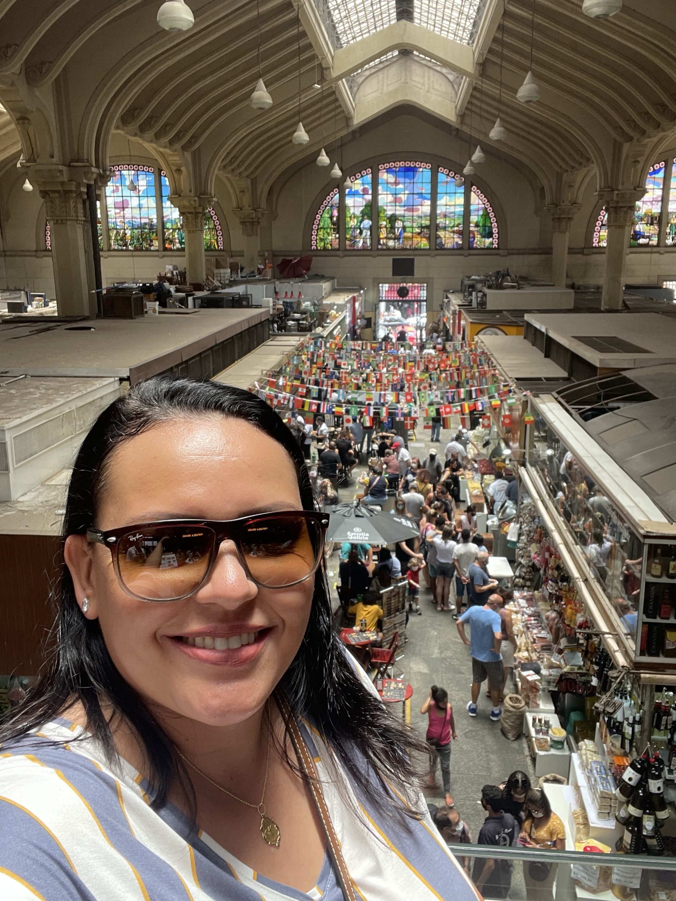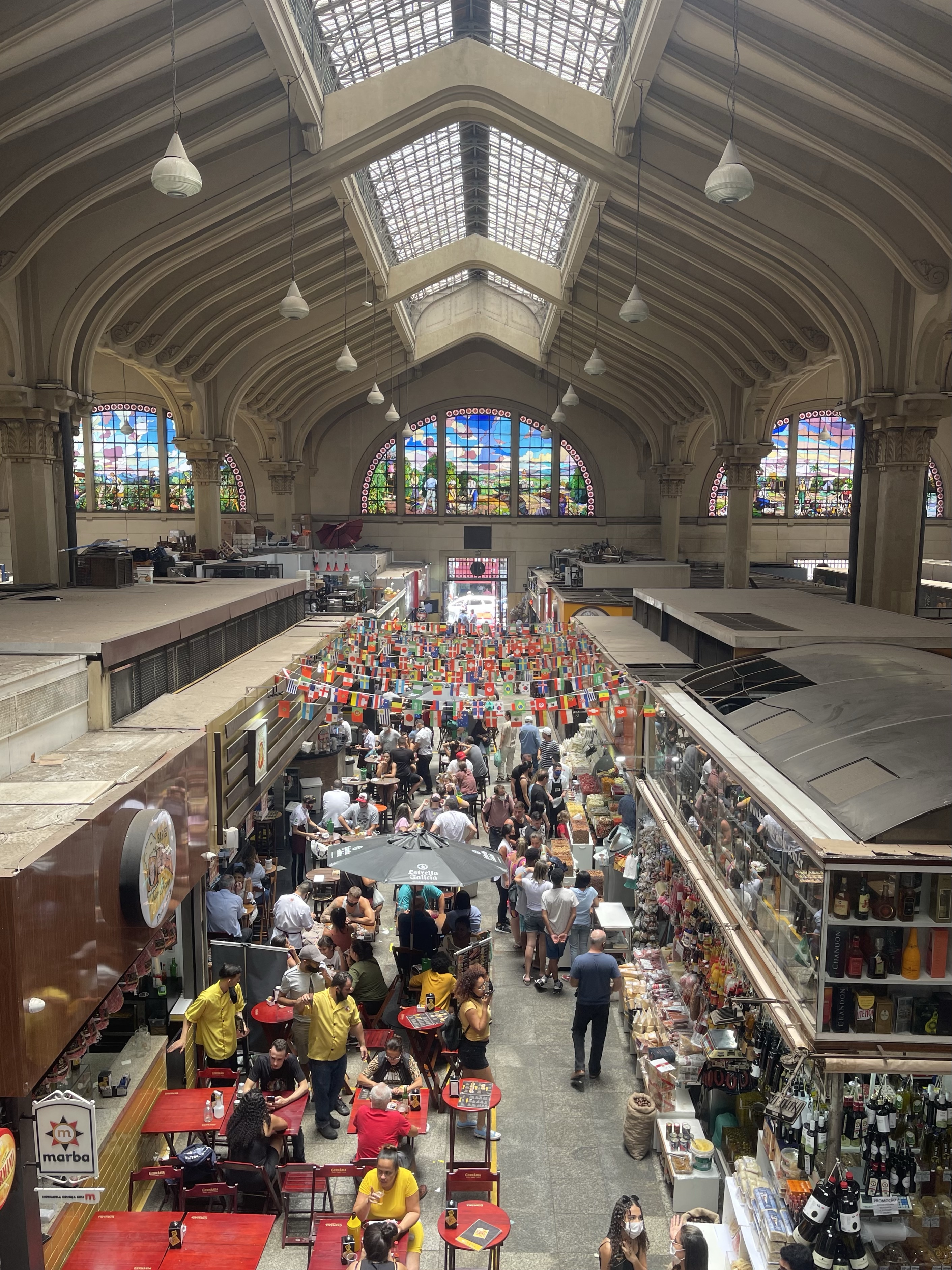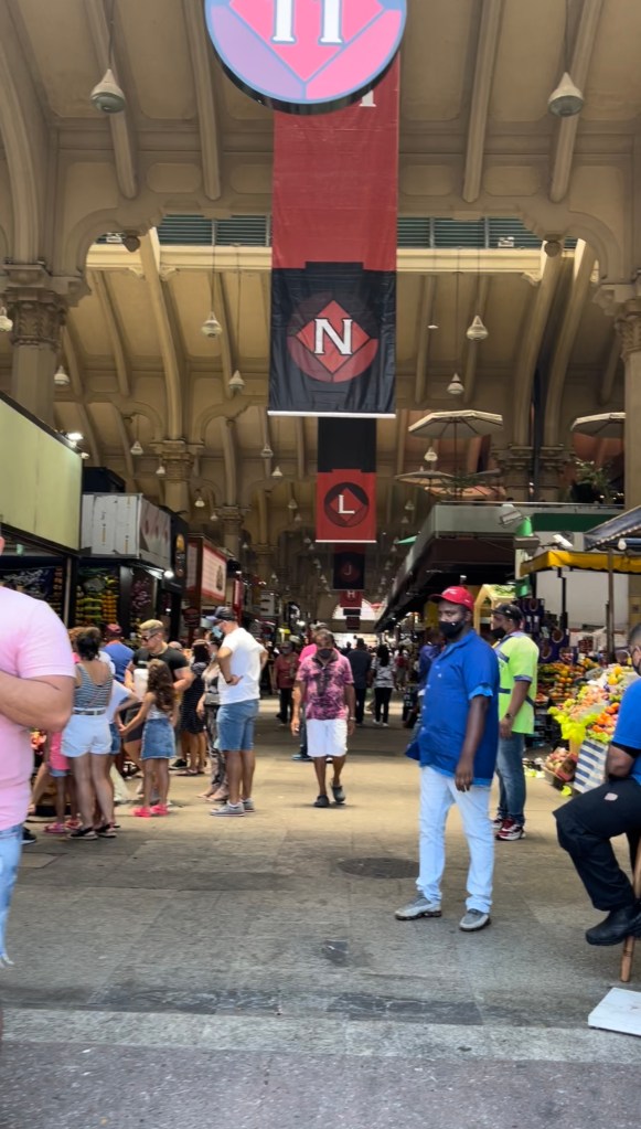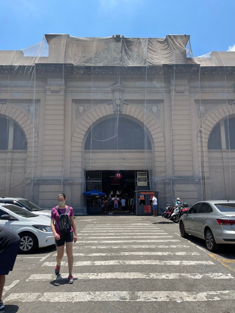 Cerca de 5 minutos caminhando, cheguei ao Mercado Municipal de São Paulo. Por fora estava em reforma, mas por dentro continuava operando normalmente. Estava lotado!