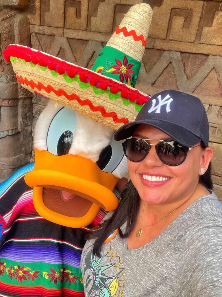 Saindo de lá, descobri que o Pato Donald estava na lateral da pirâmide vestido de mexicano. Não resisti e fui lá tirar uma foto com ele. Por isso é importante acompanhar tudo pelo app da Disney.