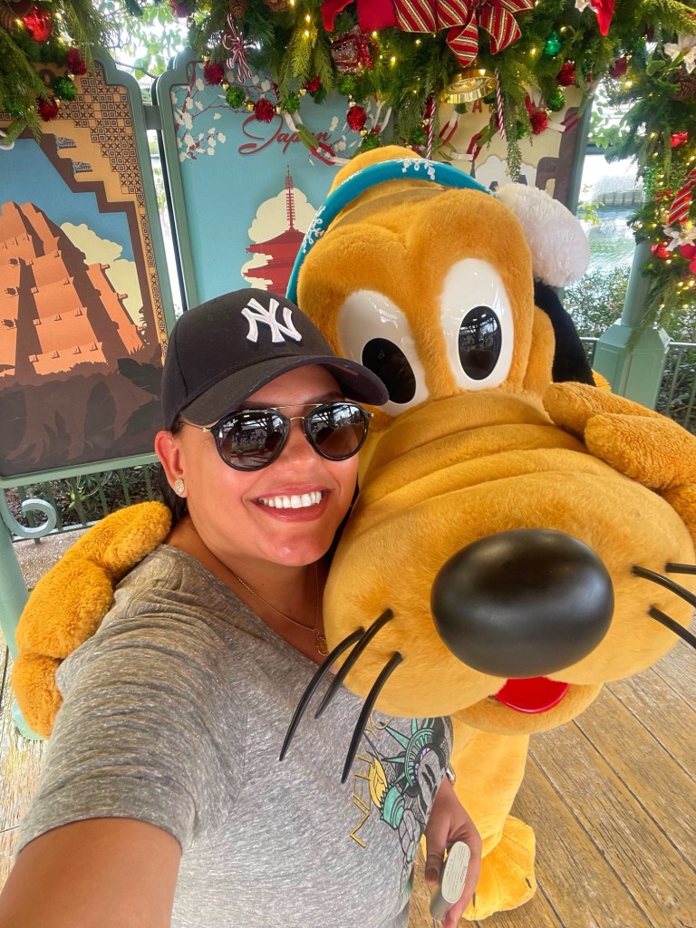 Saindo da Noruega eu ia seguir para o próximo pavilhão, mas descobri que o Pluto estava bem alí perto, então eu decidi ir lá tirar uma foto com ele, com aquela roupinha natalina.