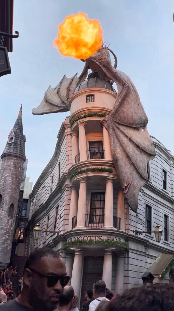 Obviamente, a grande atração do Beco Diagonal, é o dragão cuspindo fogo e já dando outra dica, ele cospe fogo de 10 em 10 minutos e em horários fechados, tipo 09:10 e depois novamente as 09:20.