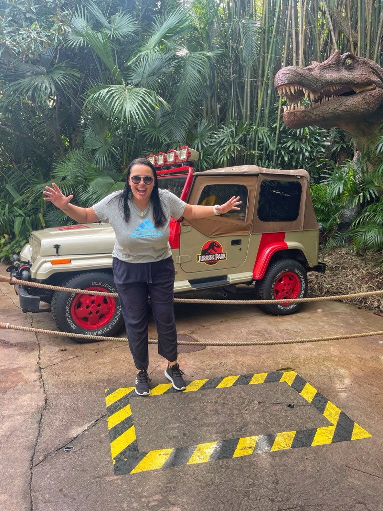 Seguindo, passei pela área de Jurassic Park e encontrei os carros com os dinossauros e também vários outros dinossauros. Eles não ficam no mesmo lugar, mas é impossível não achar eles andando pelo Islands of Adventure.