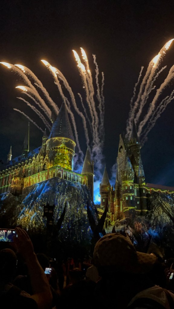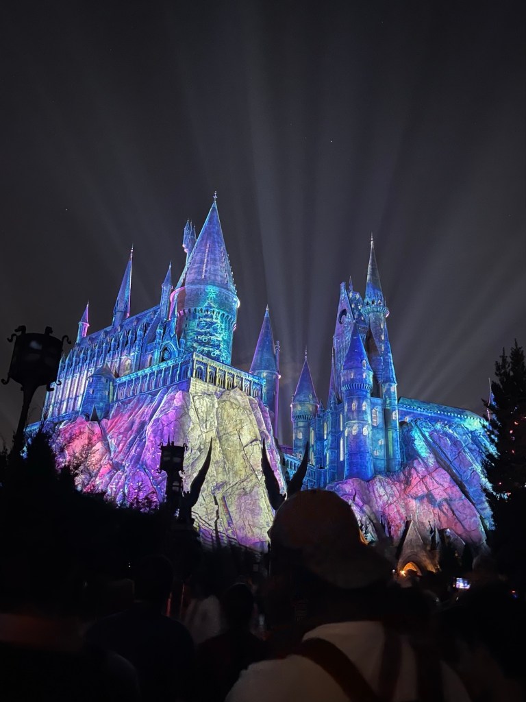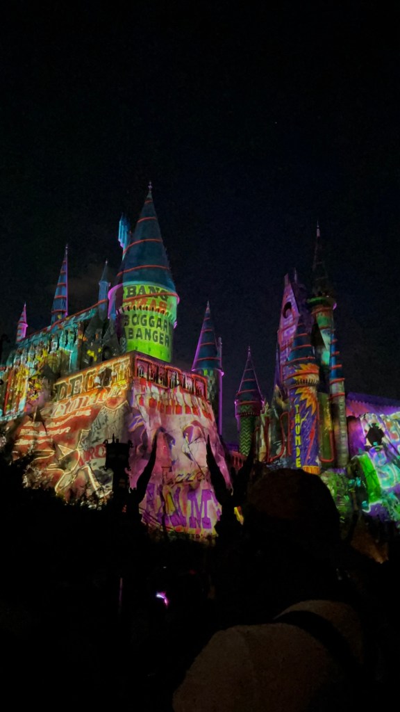 Após a parada, eu corri para Hogsmade Village, para assistir o show de luzes no Castelo de Hogwarts. Por volta das 18:15, horário que inicia o show de luzes em dezembro, é muito válido assistir. Eu fiquei impactada com essa apresentação de 15 minutos, que parece que dura uma vida e a gente não quer que acabe mais.