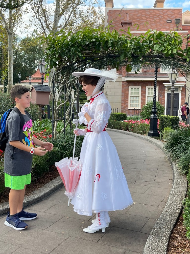 Então, novamente olhei o app, e descobri que mais duas personagens estavam próximas. Fui encontrar a Mary Poppins no Pavilhão da Inglaterra e próximo a World Showcase Plaza, estava a Margarida (Daisy Duck), a personagem mais linda.