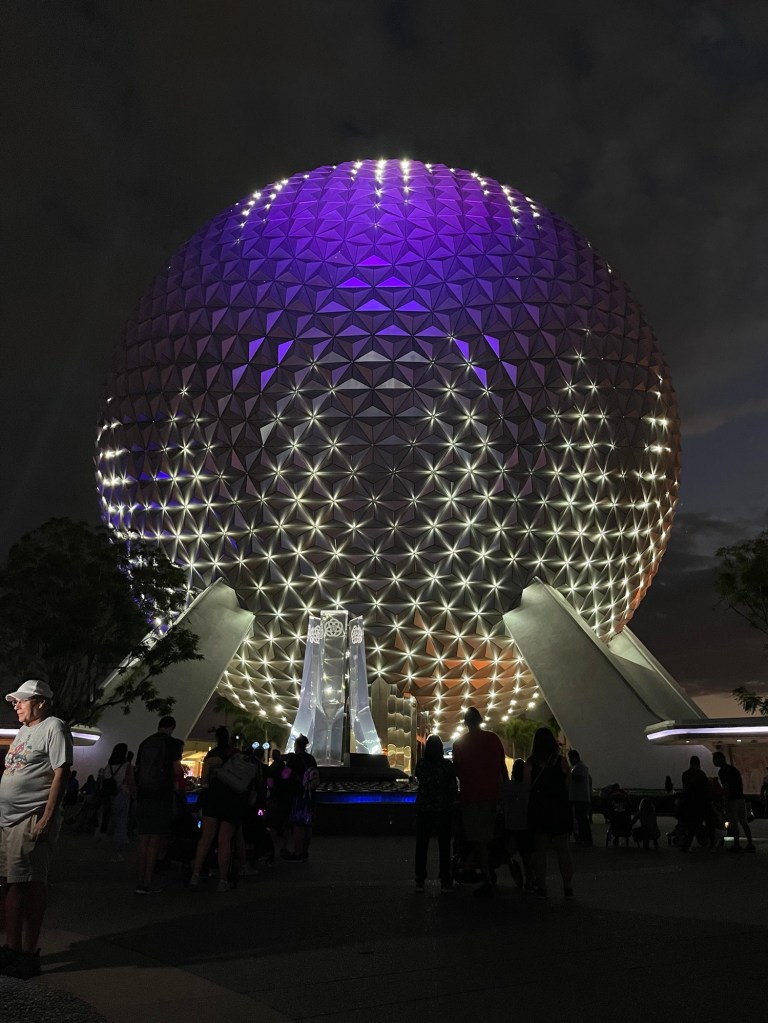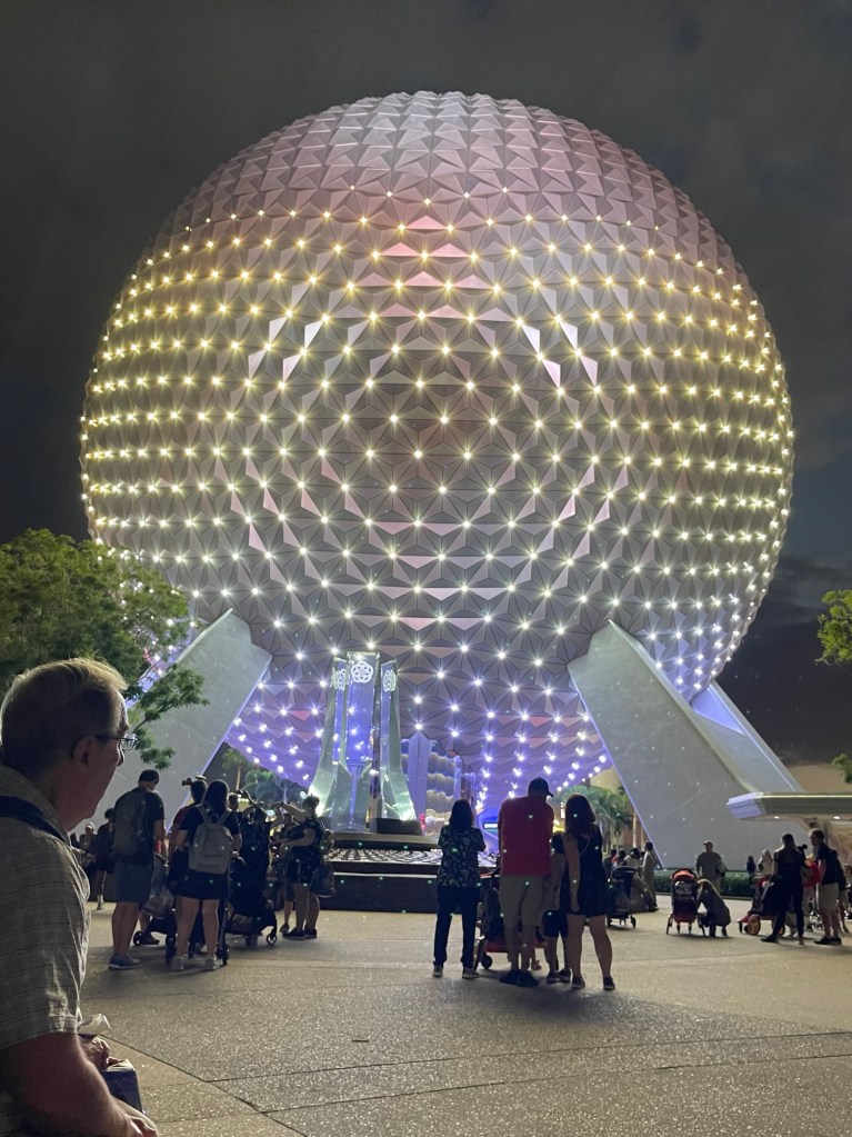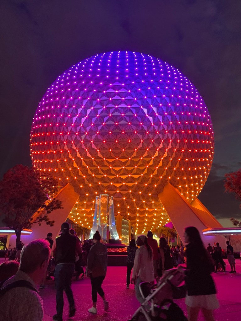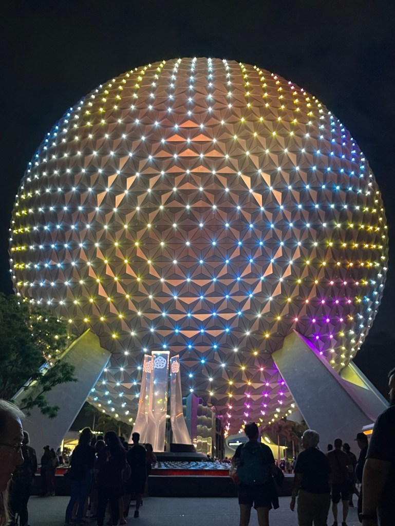 Corri para assistir o show de luzes no globo prateado. É muito lindo e nem dura tanto tempo, mas te diversas apresentações depois que começa a escurecer. Olha como ele fica colorido!