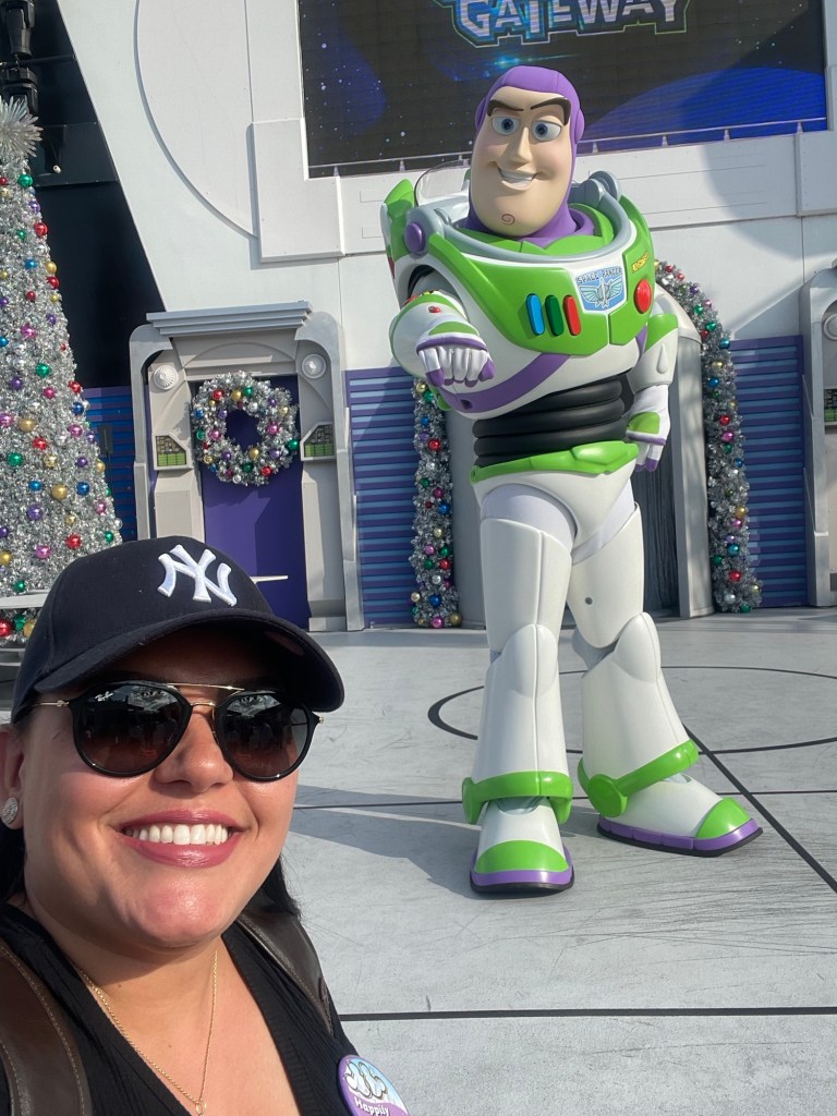 O primeiro personagem que encontrei, foi o Buzz Lightyear de Toy Story, que fica no Tomorrowland, área mais futurística do parque, a direita do Castelo da Cinderela.