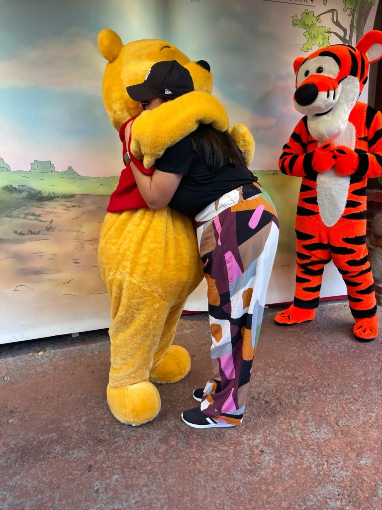 Seguindo para a próxima área do parque, cheguei na Fantasyland, onde encontrei o Ursinho Pooh (Winnie the Pooh) e o Tigrão (Tigger), no The Thotful Spot. Lindos demais!