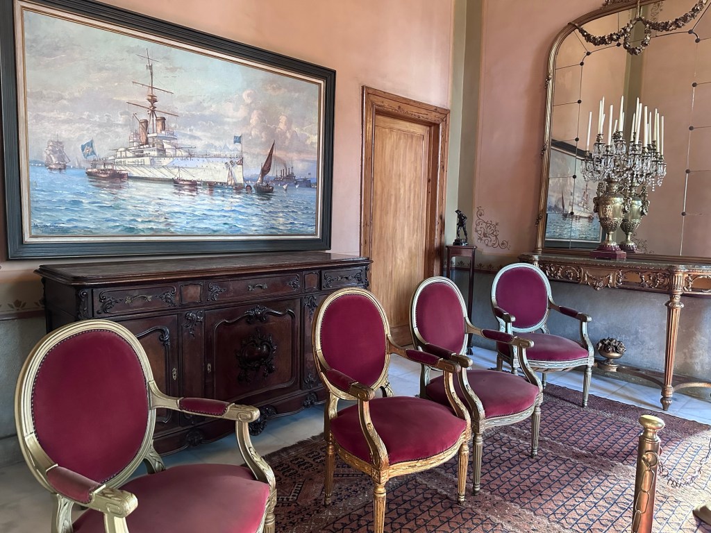 No interior do Palácio podem ser vistos os candelabros em bronze dourado, o piso em parquet, seus lustres em cristal, os painéis, a beleza da escadaria principal encomendada a uma empresa da Bélgica e o rico mobiliário.