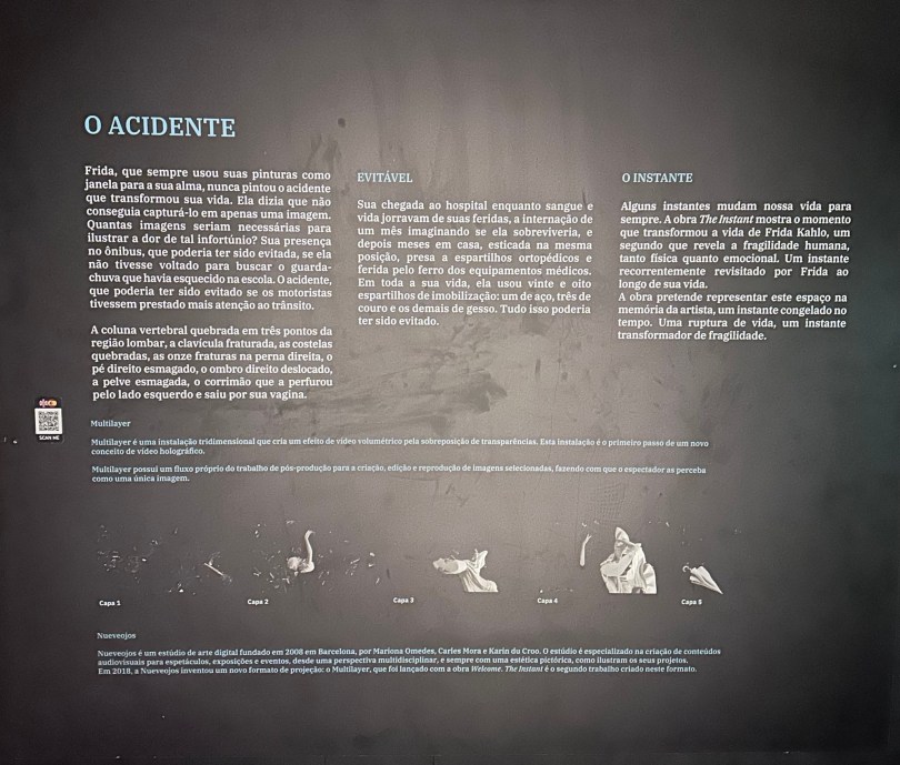 A biografia imersiva de Frida Kahlo é apresentada sem reproduções de pinturas da artista, com a intenção de dar um passo adiante em direção às novas linguagens imersivas. Os quadros contam a história de Frida em diferentes fases de sua vida.